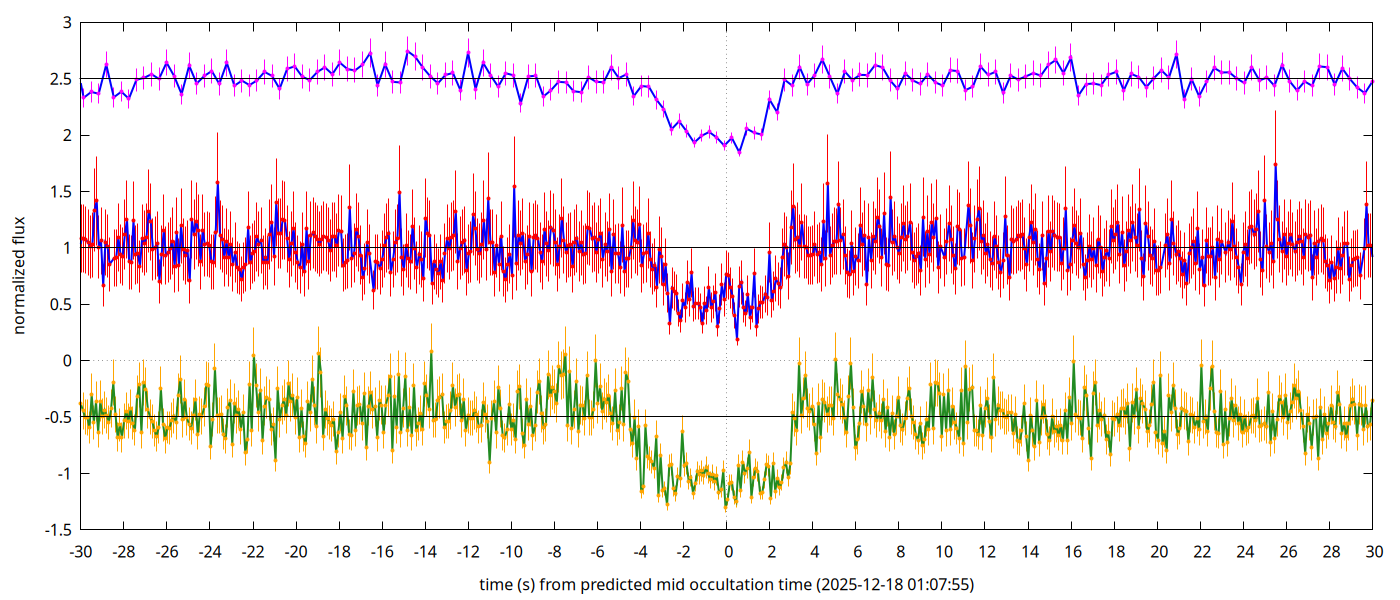 La magnitude de (146) Lucina étant sensiblement la même que l'étoile occultée, la chute de flux est d'environ 50%. Stéphane Kindt a observé une autre corde positive à 7 km de distance ; la différence de durée due à la forme de (146) Lucina est visible, mais pas trace d'une lune.
